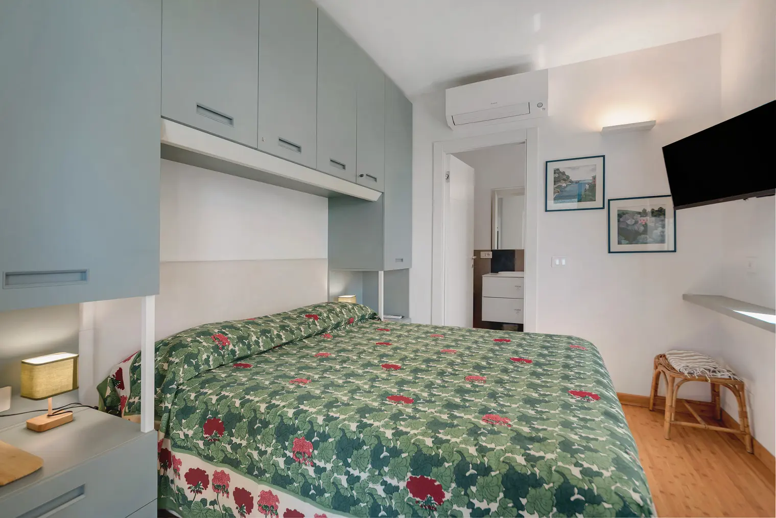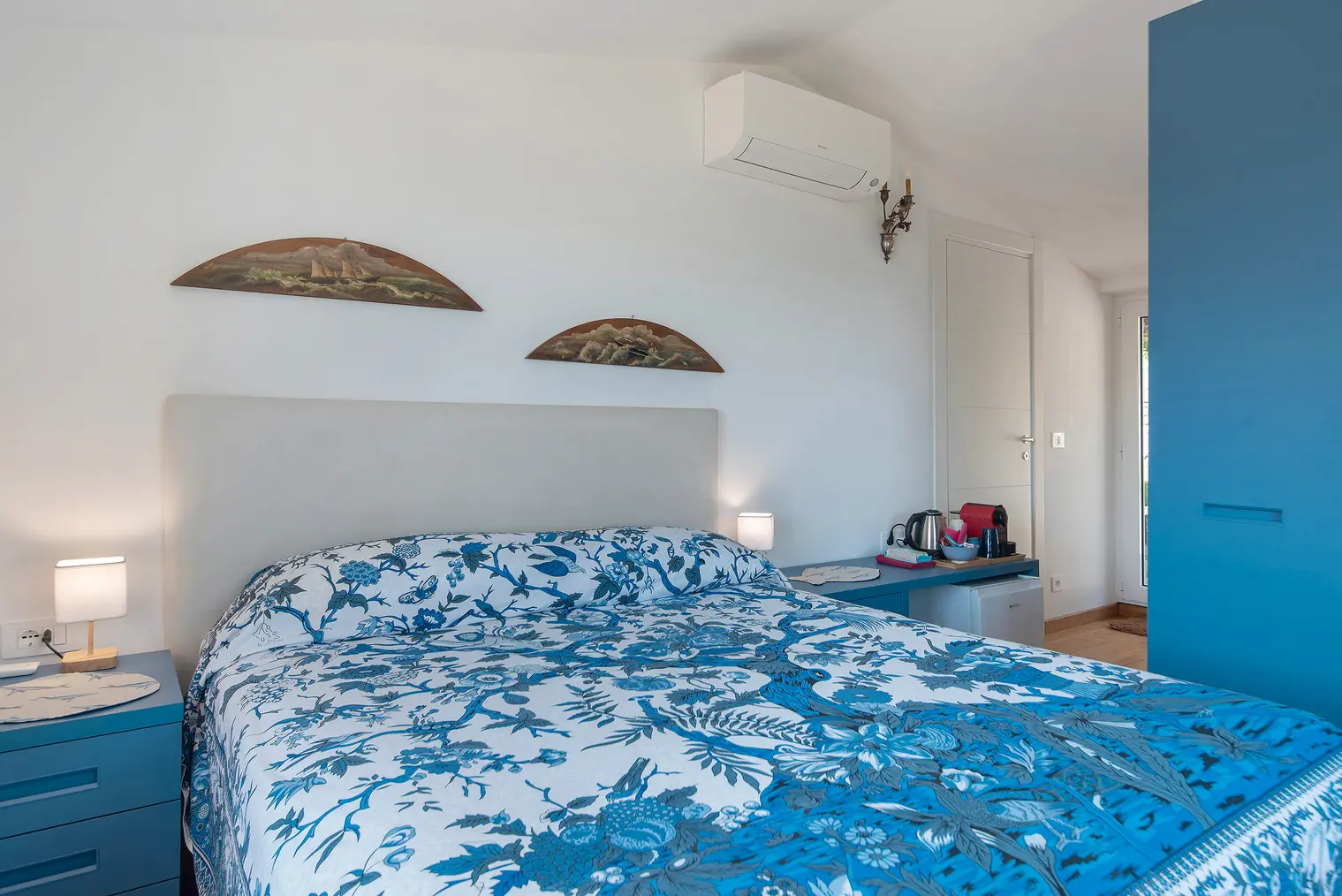The 15 m² room with independent entrance consists of a double bed, bathroom, kitchenette with coffee maker, tea kettle and refrigerator, and outdoor patio with sea view. This room can accommodate 2 people. It is possible to cook with the shared barbecue near the pool.